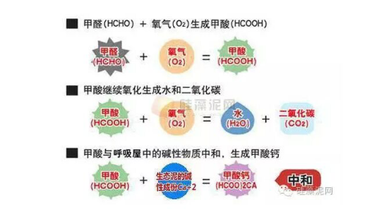 硅藻泥本身具有吸附分解作用,甲醛加上氧气合成甲酸,一部分甲酸被氧化分解,另一部分与游离钙离子反应生成甲酸钙,成为固化物。