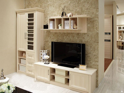 电视柜下方带有抽屉,可以放光碟等小物品,沙发与墙壁之间留一点小缝隙便于以后清扫,沙发背后的墙壁可以买一些置物板放照片,装饰品都可以