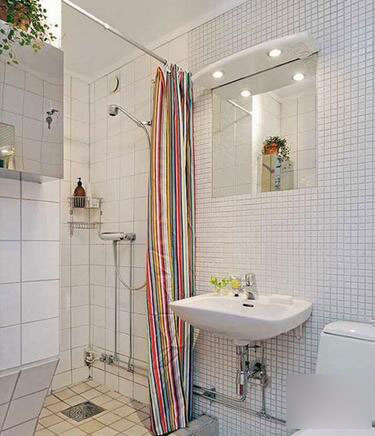 卫生间可以采用干湿分离的方法装修,不要买浴缸比较占地方,用浴帘隔挡就好,玻璃上溅上去的污渍擦起来太麻烦。