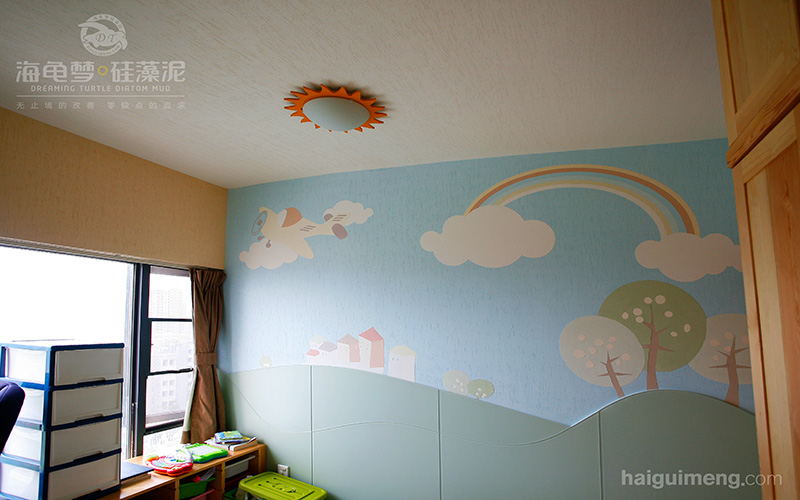 ▲海龟梦硅藻泥儿童房墙面装饰,给孩子一个健康的身体,还给孩子一片蓝天的世界