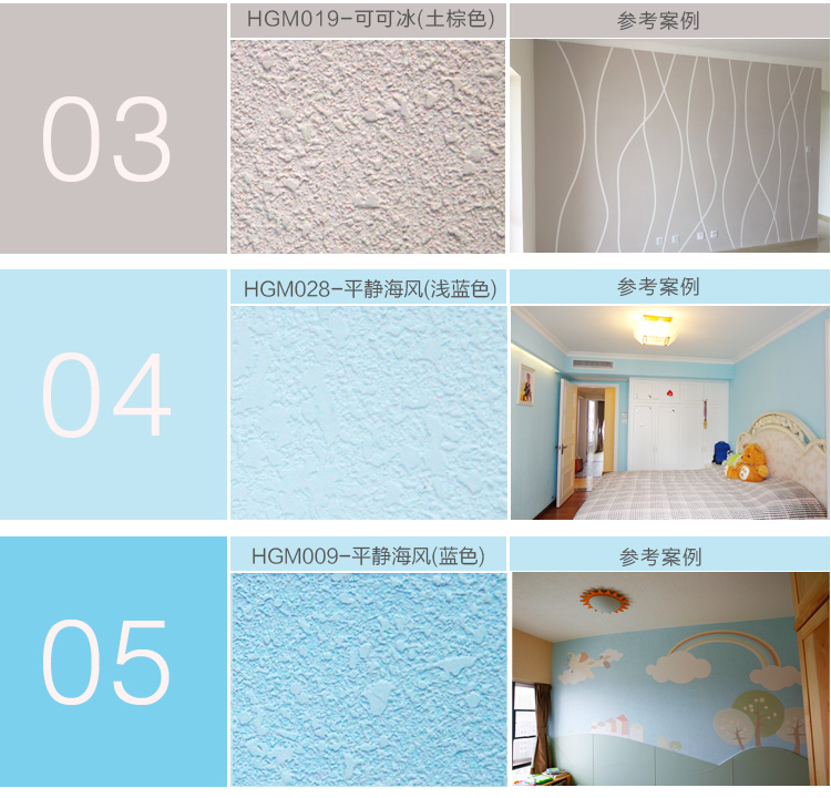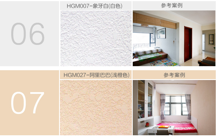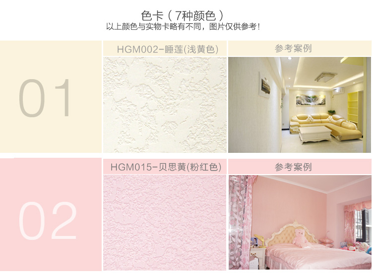 我们可以根据客户的需求制定出不同的颜色,但是很多颜色上墙之后并不是那么好看。经过我们反复试验和收集客户的反馈。我们现推出七种最常用、最时尚的颜色:白色、米黄色、浅绿色、浅粉色、浅蓝色、浅紫色、浅橙色。