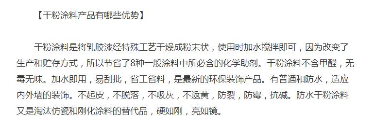 刚开始的时候,并没有准备去海龟梦这家店,路过,看到干粉涂料几个字,倒是留下了一些印象。回来上网查资料看效果图的时候,顺便搜索了一下,发现挺有优势的。这是网上的介绍,截图: