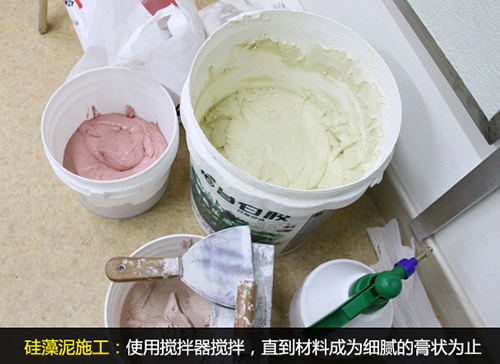 检查硅藻泥包装袋是否完整,清除包装袋外表的污物,用剪刀打开包装袋封口。先将7成材料慢慢倒入桶中,然后使用搅拌器搅拌,待干粉和色浆水完全混合后,再将剩余的材料倒入桶内,继续搅拌,直到材料成为细腻的膏状(没有颗粒状、结块状)为止。正式施工前再搅拌几分钟。