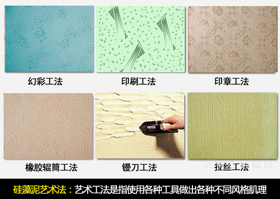 工具:艺术工法从使用的工具看,通常有辊筒、镘刀、毛刷、丝网等。从肌理表现上看,以仿照自然图案为主,有写实的手法,也有抽象的表现,如花草、砂岩、木纹、年轮等。