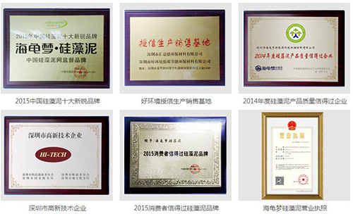 海龟梦硅藻泥获得八大实用新型专利和二项发明专利、硅藻泥产品质量信得过企业、中国硅藻泥十大新锐品牌、深圳高新技术企业以及有害物质检测报告、甲醛净化检测报告等等,都是海龟梦实力企业的标志。