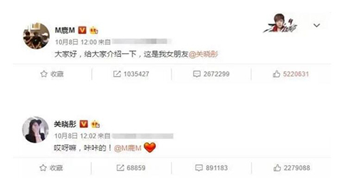 十一长假最后一天,有着傻狍子称呼的鹿晗在微博上公开恋爱:“大家好,给大家介绍一下,这是我女朋友@关晓彤”。一时间微博瘫痪,很多网友表示不敢相信,但随着双方经纪人给予确认,粉丝们才慢慢开始接受这一现实。与此同时,朋友圈也演变成了:“大家好,给大家介绍一下,这是我XXX”。