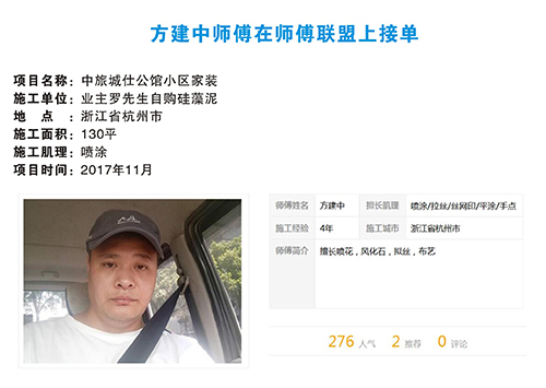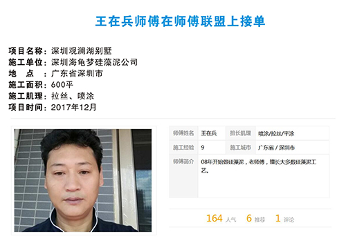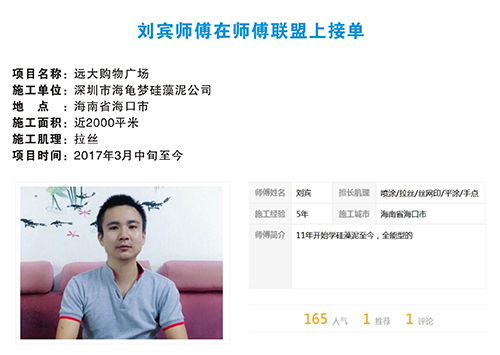 师傅联盟,搜罗全国各地手艺精湛的大师傅进入联盟,在师傅联盟平台上完善师傅信息,展示师傅作品,以供客户选择。全国各地的顾客,都可以在该平台上一键预约心仪的师傅。师傅联盟还将与对应培训机构合作,进行新人培训,并为合格者颁发证书,力争让硅藻泥行业有规可循。