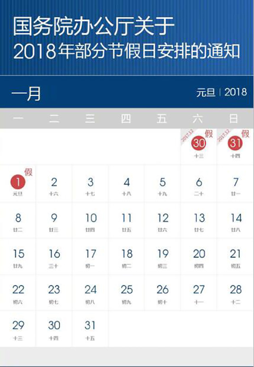 一、放假时间:2017年12月30日——2018年1月1日,共3天。2018年1月2日照常上班。