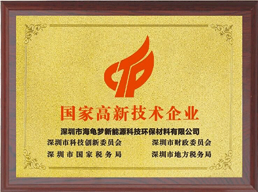 2018年10月15日,深圳市海龟梦新能源科技环保材料有限公司通过由深圳市科技创新委员会、深圳市财政委员会、深圳市国家税务局、深圳市地方税务局联合批准的高新技术企业认证,并获得荣誉证书。