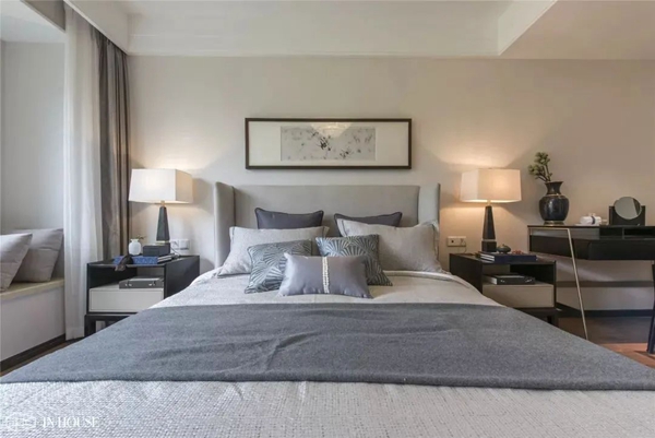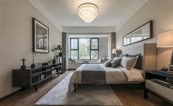 新中式与灰的碰撞,看似简单却不随性,混搭新颖又各有韵味。东方意蕴的经典色彩搭配深色家具的沉稳静默,唤活空间风雅的氛围,身处其中既可自由选择沉入梦乡,亦可在静谧的时光闲坐沉淀内心,舒缓疲惫于都市节奏的身心,回归最真实的恬淡心境。