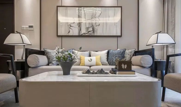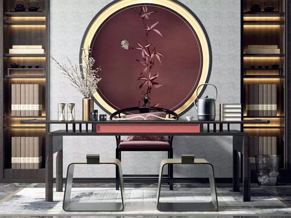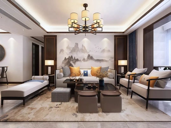海龟梦泼墨感的艺术墙面与高雅色调的新中式家具搭配,彰显优雅而低调的东方式奢华,完美展现出中国人风骨和文化情结,同时也散发出一种岁月沉淀的味道。