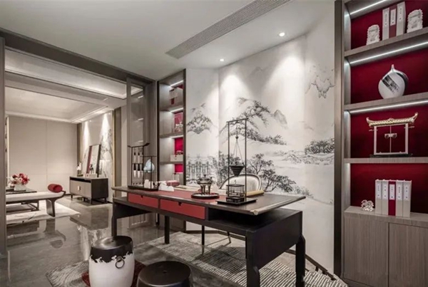书房:文墨重彩,笔墨丹青,自然营造一种对知识、对文学的敬畏,宁心静气,肃然高雅。书房中简约的中式造型桌子与水墨背景散发着简美古朴的味道。素年锦时,岁月静好。设计师将书写阅读的场景搭建出婉约闲逸的意境美。.jpg)