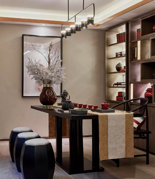 海龟梦泼墨感的艺术墙面与高雅色调的新中式家具搭配,彰显优雅而低调的东方式奢华,完美展现出中国人风骨和文化情结,同时也散发出一种岁月沉淀的味道。茶室是划分室外喧嚣与内心宁静划天然屏障,低调冷艳的高级灰在木质转换的加持下,为空间带来一丝温存与高雅之感,串联起室内的情感主线。