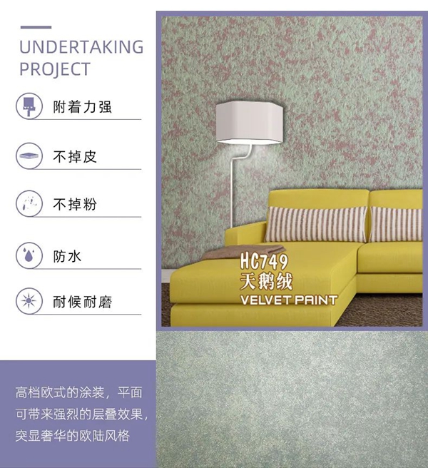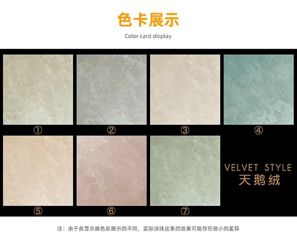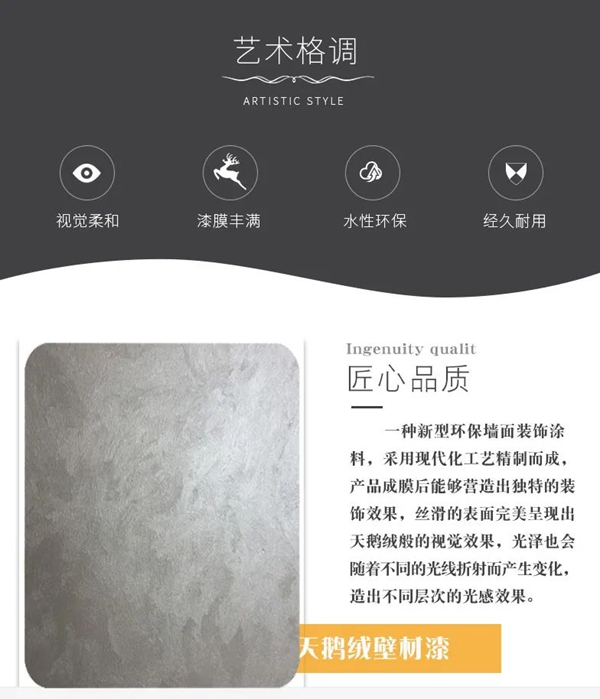 闪耀着珍珠般的光芒,在不同的光线和角度下产生明暗变化。饰面柔韧耐用,不同工具和手法,创造出了非凡的艺术盛宴,极致奢华之美。通过色调的变化,诠释与众不同的高雅。天鹅绒一款高颜值的艺术漆,柔润的手感好似天鹅绒毛一般,斑驳璀璨的光泽,这正是大部分人喜欢它的原因。