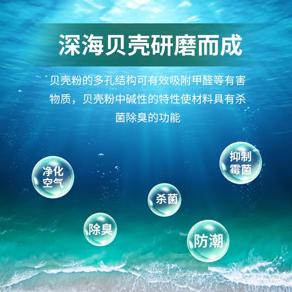 不仅自身环保性能突出,而且贝壳粉涂料还具有许多传统涂料所不具备的实用功能。 由于采用贝壳为原料,贝壳粉涂料具有独特的微孔结构和自然吸附,可有效吸附空气中的甲醛和有害气体。与传统涂料3-5年的使用寿命相比,贝壳粉末涂料的使用寿命长达20年。 一次涂刷,一劳永逸。